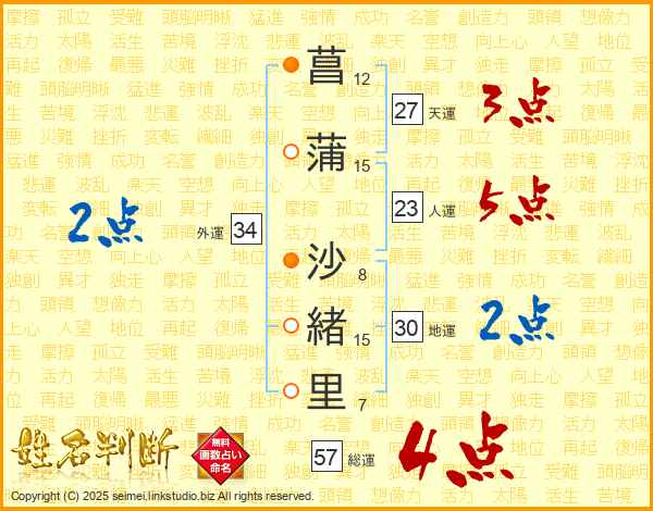 菖(12画)蒲(15画) 沙(8画)緒(15画)里(7画)