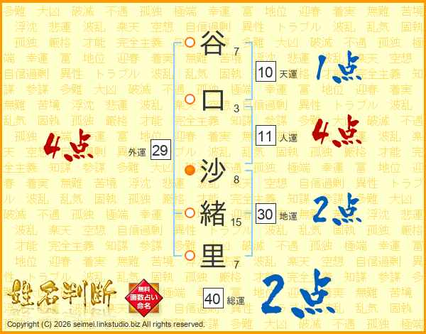 谷(7画)口(3画) 沙(8画)緒(15画)里(7画)