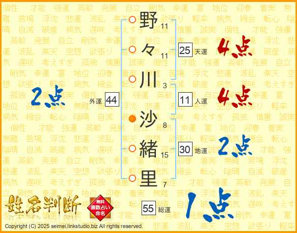 野(11画)々(11画)川(3画) 沙(8画)緒(15画)里(7画)