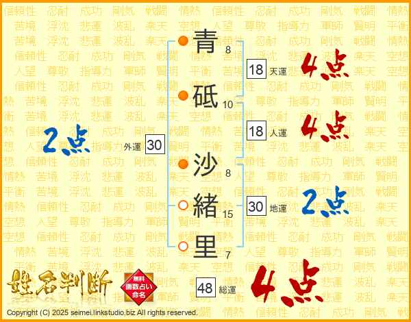 青(8画)砥(10画) 沙(8画)緒(15画)里(7画)
