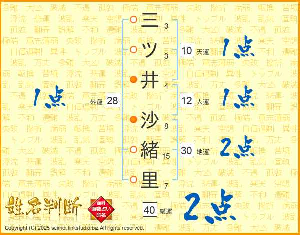 三(3画)ツ(3画)井(4画) 沙(8画)緒(15画)里(7画)