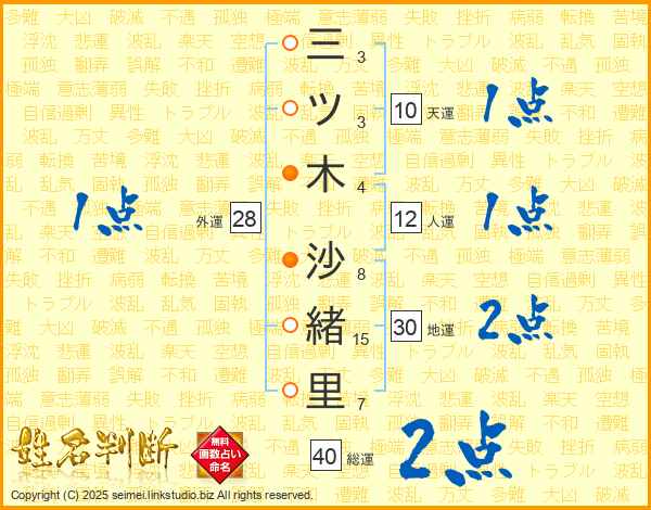 三(3画)ツ(3画)木(4画) 沙(8画)緒(15画)里(7画)