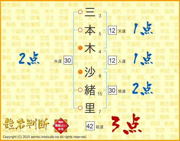 三(3画)本(5画)木(4画) 沙(8画)緒(15画)里(7画)