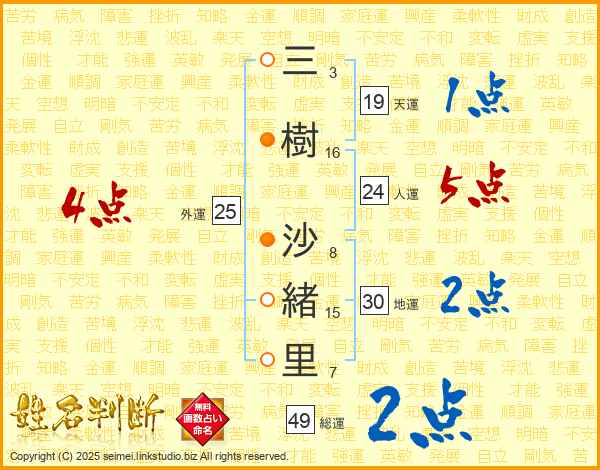三(3画)樹(16画) 沙(8画)緒(15画)里(7画)