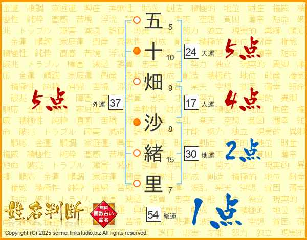 五(5画)十(10画)畑(9画)  沙(8画)緒(15画)里(7画)