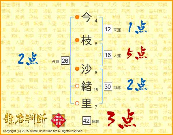 今(4画)枝(8画) 沙(8画)緒(15画)里(7画)