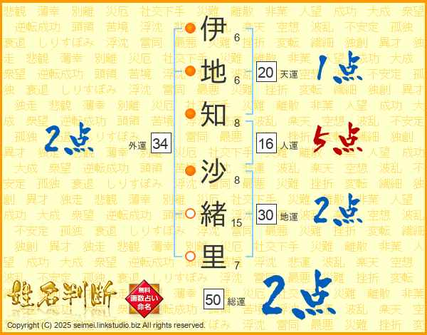伊(6画)地(6画)知(8画) 沙(8画)緒(15画)里(7画)