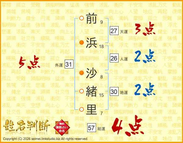 前(9画)浜(18画) 沙(8画)緒(15画)里(7画)