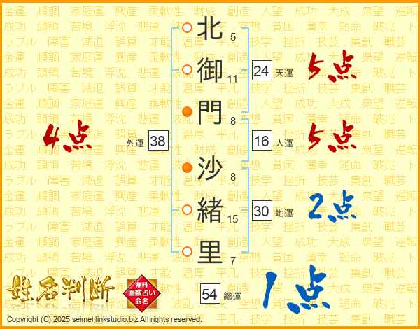 北(5画)御(11画)門(8画) 沙(8画)緒(15画)里(7画)