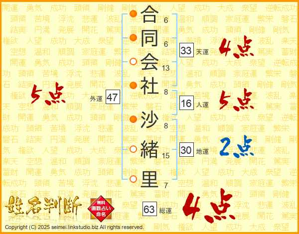 合(6画)同(6画)会(13画)社(8画) 沙(8画)緒(15画)里(7画)