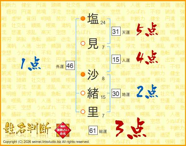 塩(24画)見(7画) 沙(8画)緒(15画)里(7画)