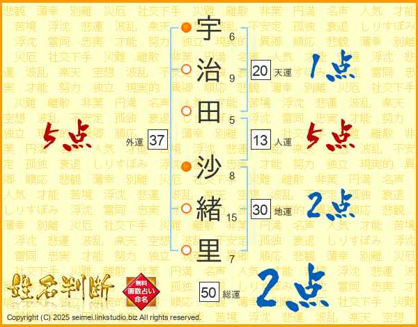 宇(6画)治(9画)田(5画) 沙(8画)緒(15画)里(7画)