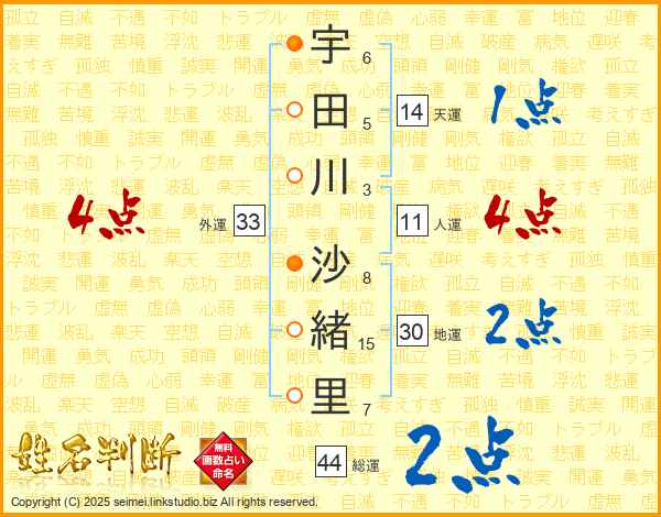宇(6画)田(5画)川(3画) 沙(8画)緒(15画)里(7画)