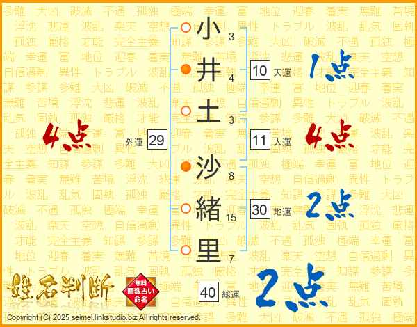 小(3画)井(4画)土(3画) 沙(8画)緒(15画)里(7画)