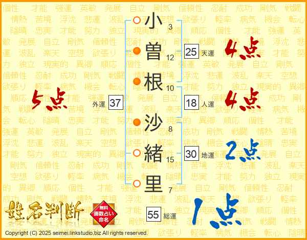 小(3画)曽(12画)根(10画) 沙(8画)緒(15画)里(7画)
