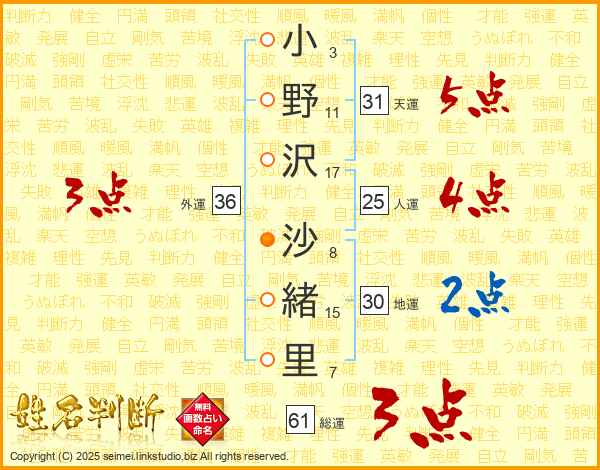 小(3画)野(11画)沢(17画) 沙(8画)緒(15画)里(7画)