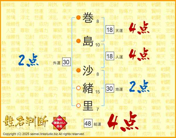 巻(8画)島(10画) 沙(8画)緒(15画)里(7画)