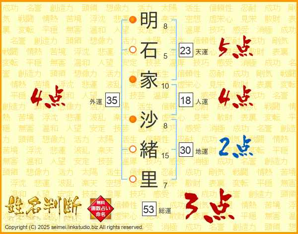 明(8画)石(5画)家(10画) 沙(8画)緒(15画)里(7画)
