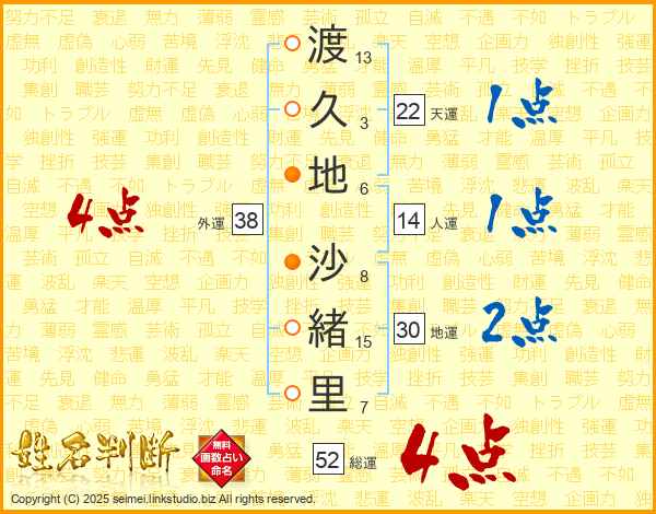 渡(13画)久(3画)地(6画) 沙(8画)緒(15画)里(7画)