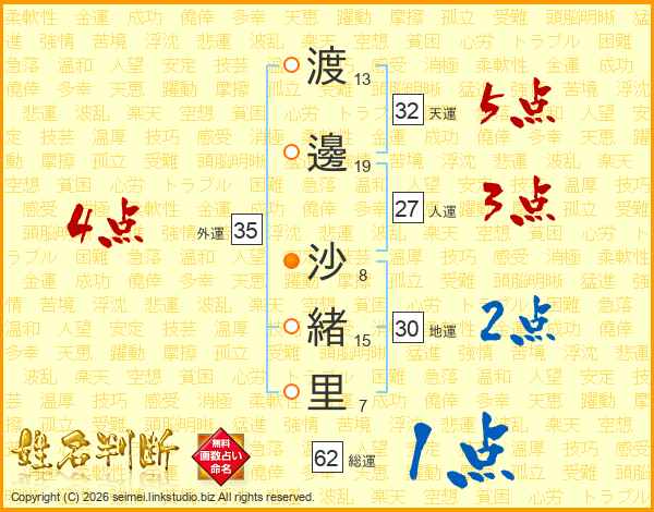 渡(13画)邊(19画) 沙(8画)緒(15画)里(7画)