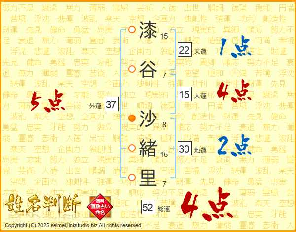 漆(15画)谷(7画) 沙(8画)緒(15画)里(7画)
