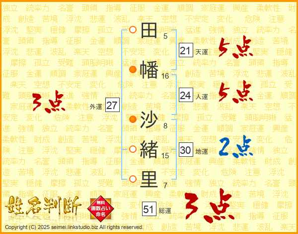 田(5画)幡(16画) 沙(8画)緒(15画)里(7画)