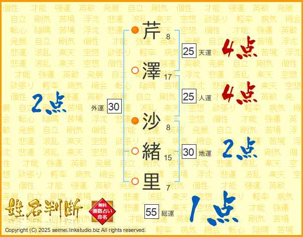 芹(8画)澤(17画) 沙(8画)緒(15画)里(7画)