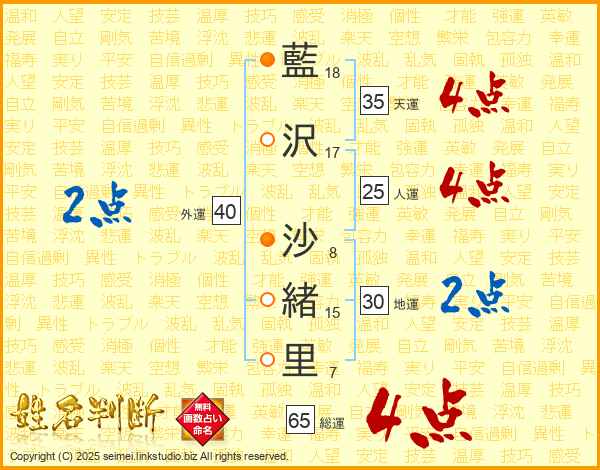 藍(18画)沢(17画) 沙(8画)緒(15画)里(7画)