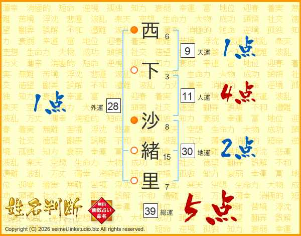 西下沙緒里さんの総運は39画の5点!