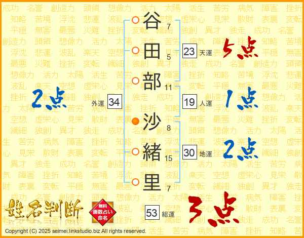 谷(7画)田(5画)部(11画) 沙(8画)緒(15画)里(7画)