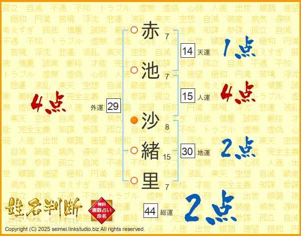 赤(7画)池(7画) 沙(8画)緒(15画)里(7画)