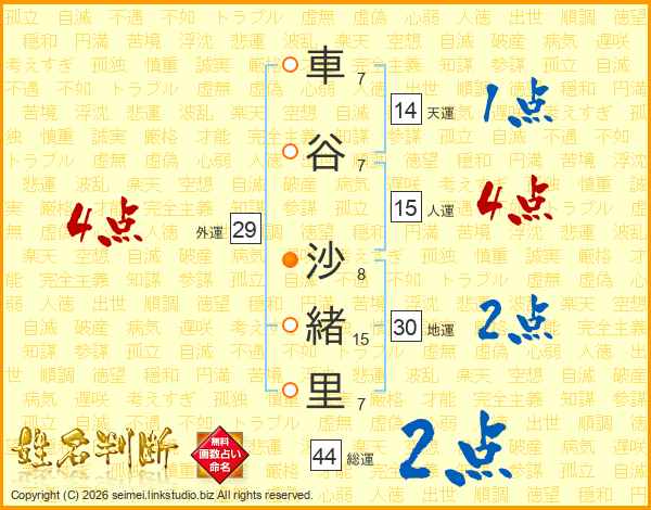 車(7画)谷(7画) 沙(8画)緒(15画)里(7画)