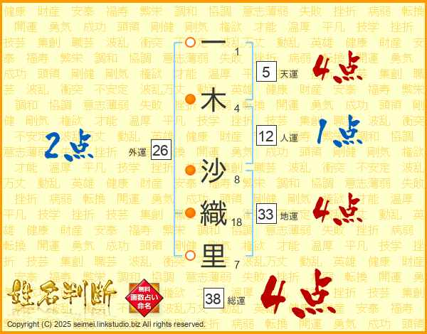 一(1画)木(4画) 沙(8画)織(18画)里(7画)