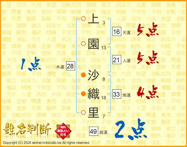 上(3画)園(13画) 沙(8画)織(18画)里(7画)