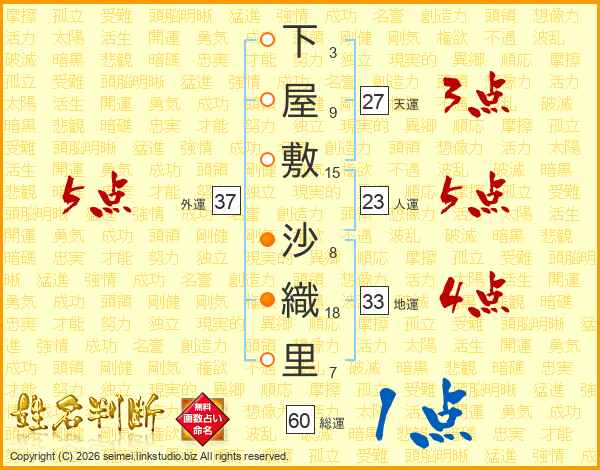 下(3画)屋(9画)敷(15画) 沙(8画)織(18画)里(7画)