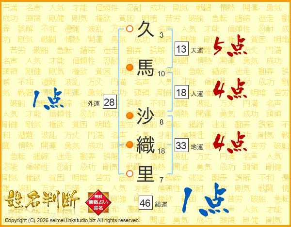 久(3画)馬(10画) 沙(8画)織(18画)里(7画)