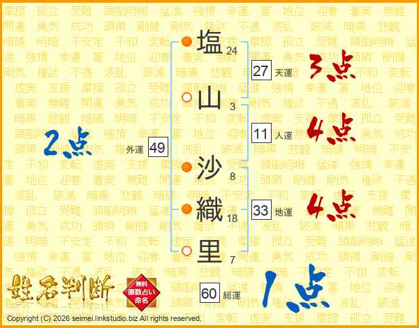 塩(24画)山(3画) 沙(8画)織(18画)里(7画)