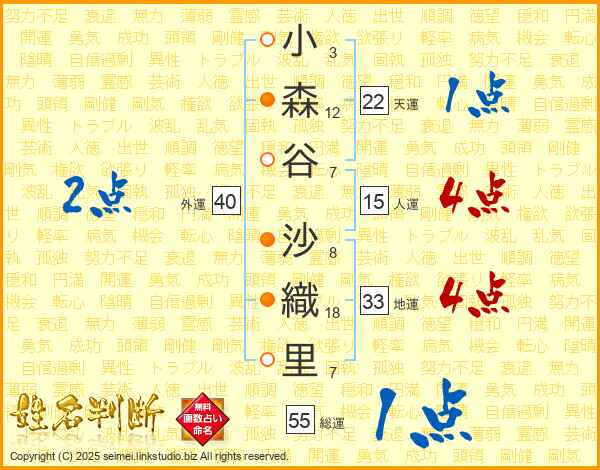 小(3画)森(12画)谷(7画) 沙(8画)織(18画)里(7画)