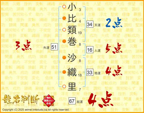 小(3画)比(4画)類(19画)巻(8画) 沙(8画)織(18画)里(7画)