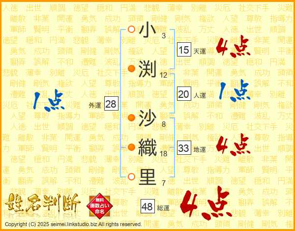小(3画)渕(12画) 沙(8画)織(18画)里(7画)
