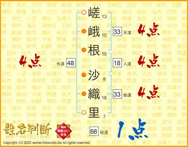嵯(13画)峨(10画)根(10画) 沙(8画)織(18画)里(7画)