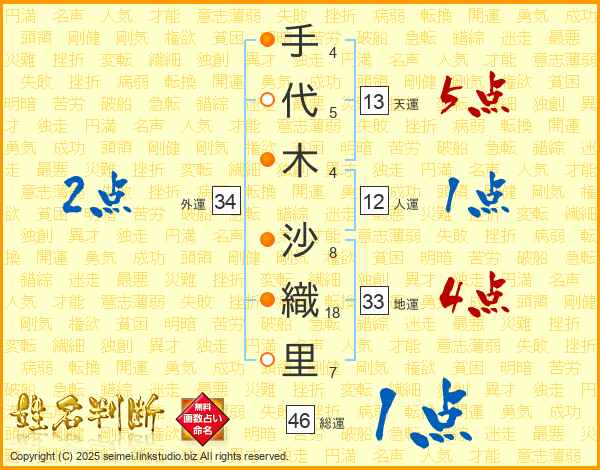 手(4画)代(5画)木(4画) 沙(8画)織(18画)里(7画)