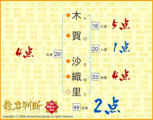 木(4画)賀(12画) 沙(8画)織(18画)里(7画)
