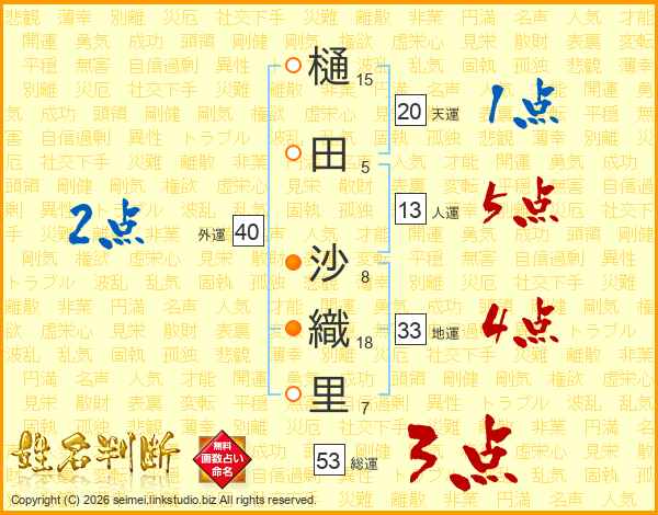 樋(15画)田(5画) 沙(8画)織(18画)里(7画)