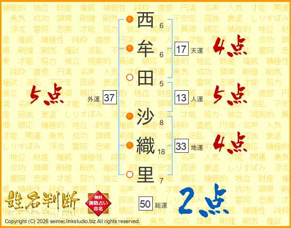 西(6画)牟(6画)田(5画) 沙(8画)織(18画)里(7画)