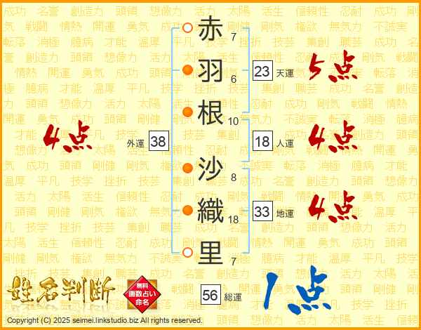 赤(7画)羽(6画)根(10画) 沙(8画)織(18画)里(7画)