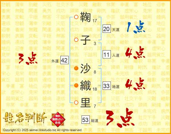 鞠(17画)子(3画) 沙(8画)織(18画)里(7画)