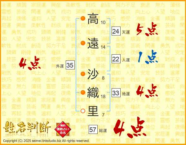 高(10画)遠(14画) 沙(8画)織(18画)里(7画)
