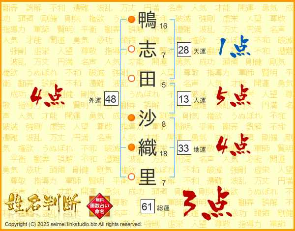 鴨(16画)志(7画)田(5画) 沙(8画)織(18画)里(7画)