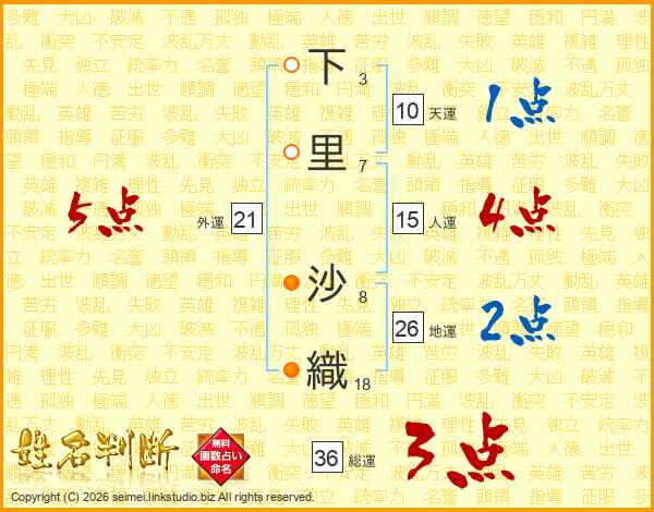 下(3画)里(7画) 沙(8画)織(18画)